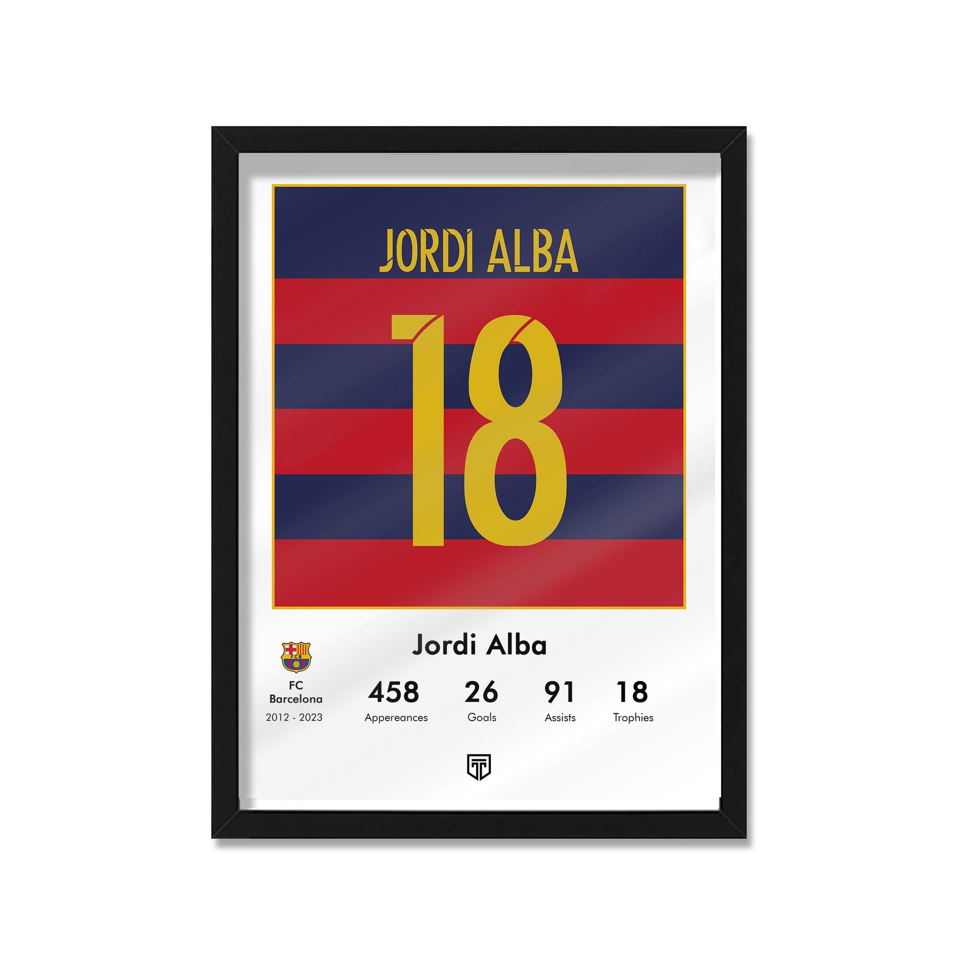 CUADRO DECORATIVO CAMISETA ENMARCADA FÚTBOL ILUSTRACIÓN HALL OF FAME JORDI ALBA FC BARCELONA STATS ESTADÍSTICAS