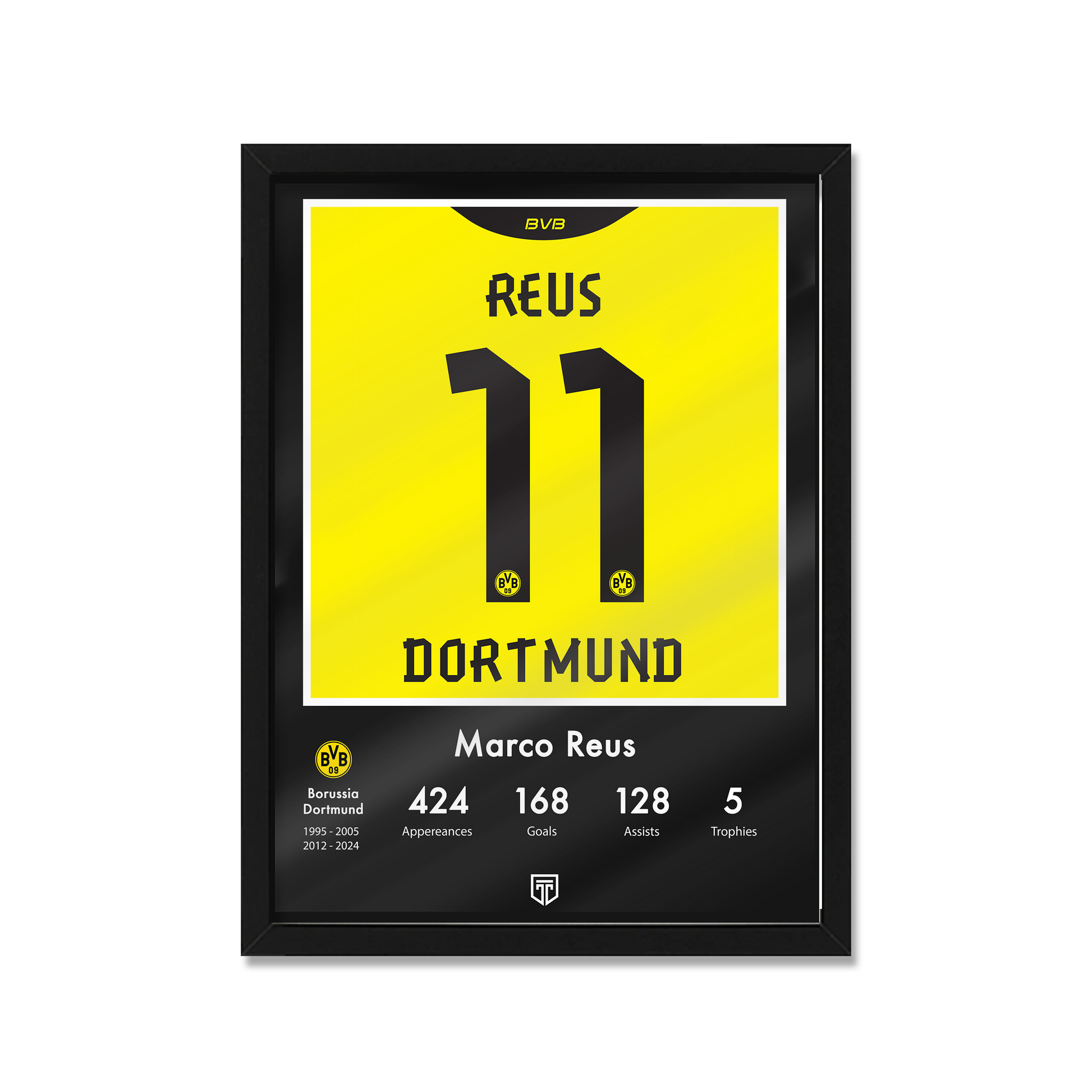CUADRO DECORATIVO CAMISETA ENMARCADA FÚTBOL ILUSTRACIÓN MARCO REUS HALL OF FAME BORUSSIA DORTMUND BVB 2013 NEGRA STATS ESTADÍSTICAS