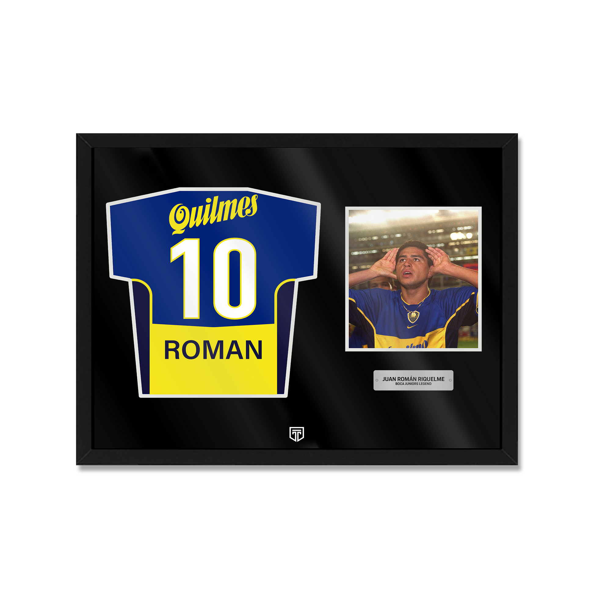 CUADRO DECORATIVO CAMISETA ENMARCADA FÚTBOL ILUSTRACIÓN MEMORABILIA ROMAN RIQUELME BOCA JUNIORS JRS ARGENTINA QUILMES FOTO PLACA