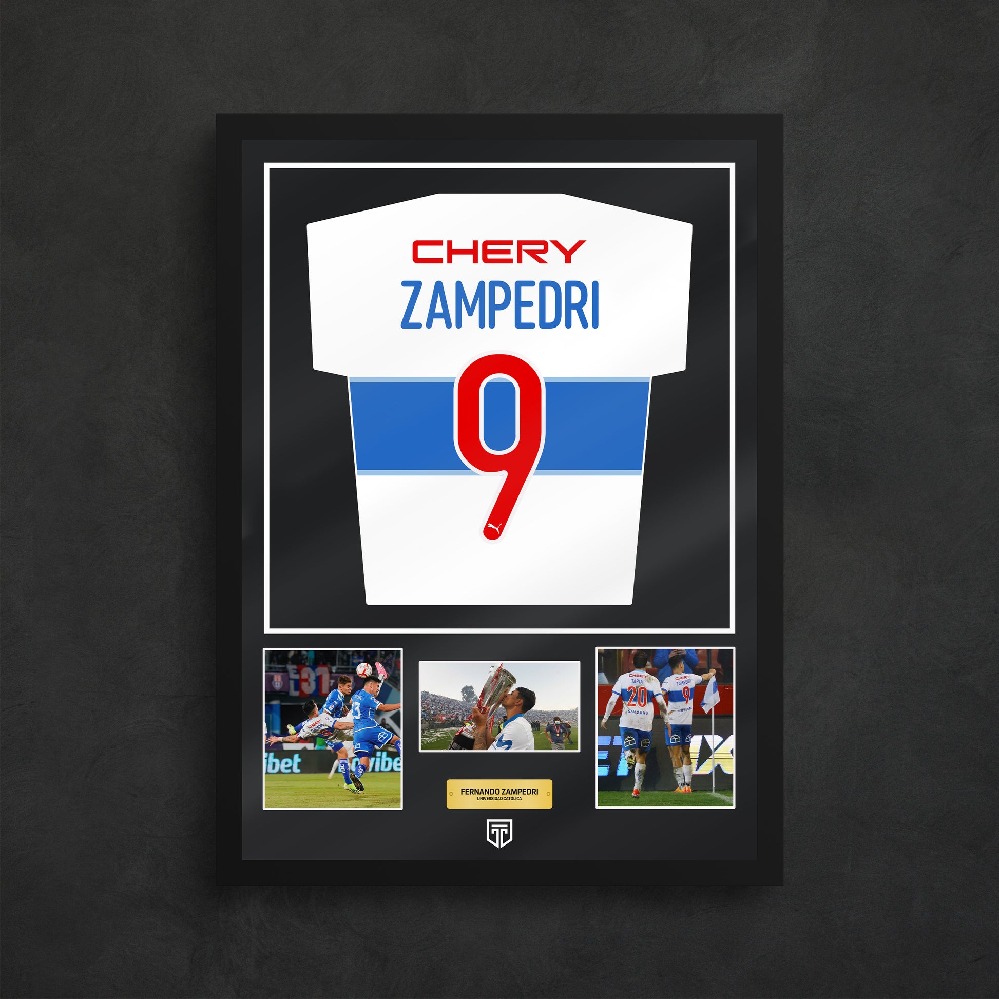 Esta pieza no es solo un cuadro; es una ilustración premium enmarcada que celebra a Fernando Zampedri, el máximo goleador histórico de la Universidad Católica. Diseñado para el fanático cruzado y el coleccionista de fútbol chileno, este formato Memorabilia destaca el impacto legendario del "Toro".